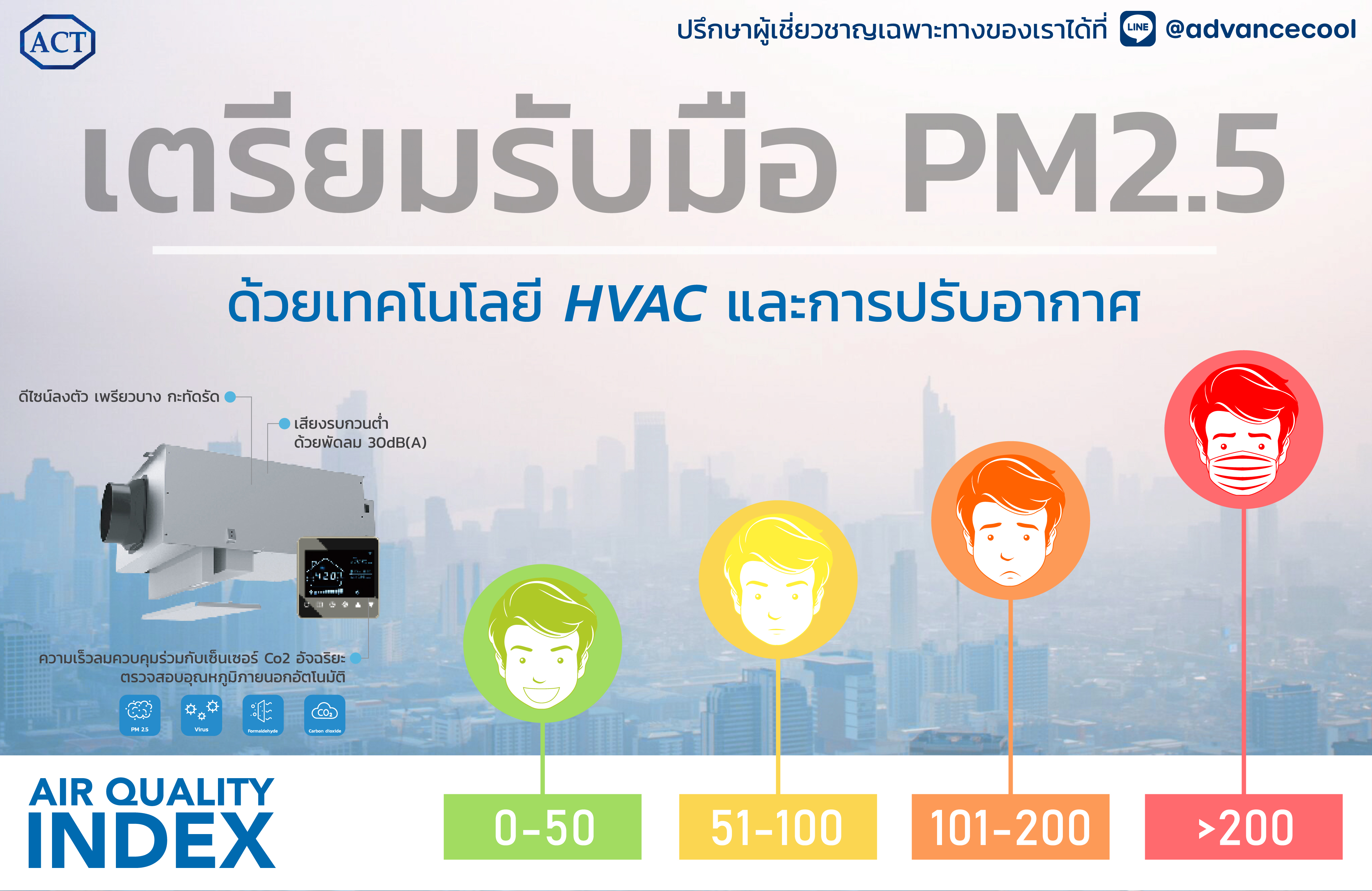 ด้วยกระบวนการต่างๆ ในการดำเนินชีวิตของมนุษย์ และกระบวนการทางอุตสาหกรรม ที่เป็นแหล่งที่มาของฝุ่น PM 2.5 สามารถบรรเทาผลกระทบของPM 2.5 ด้วยระบบ HVAC หรือระบบปรับอากาศ ด้วยวิธีต่อไปนี้