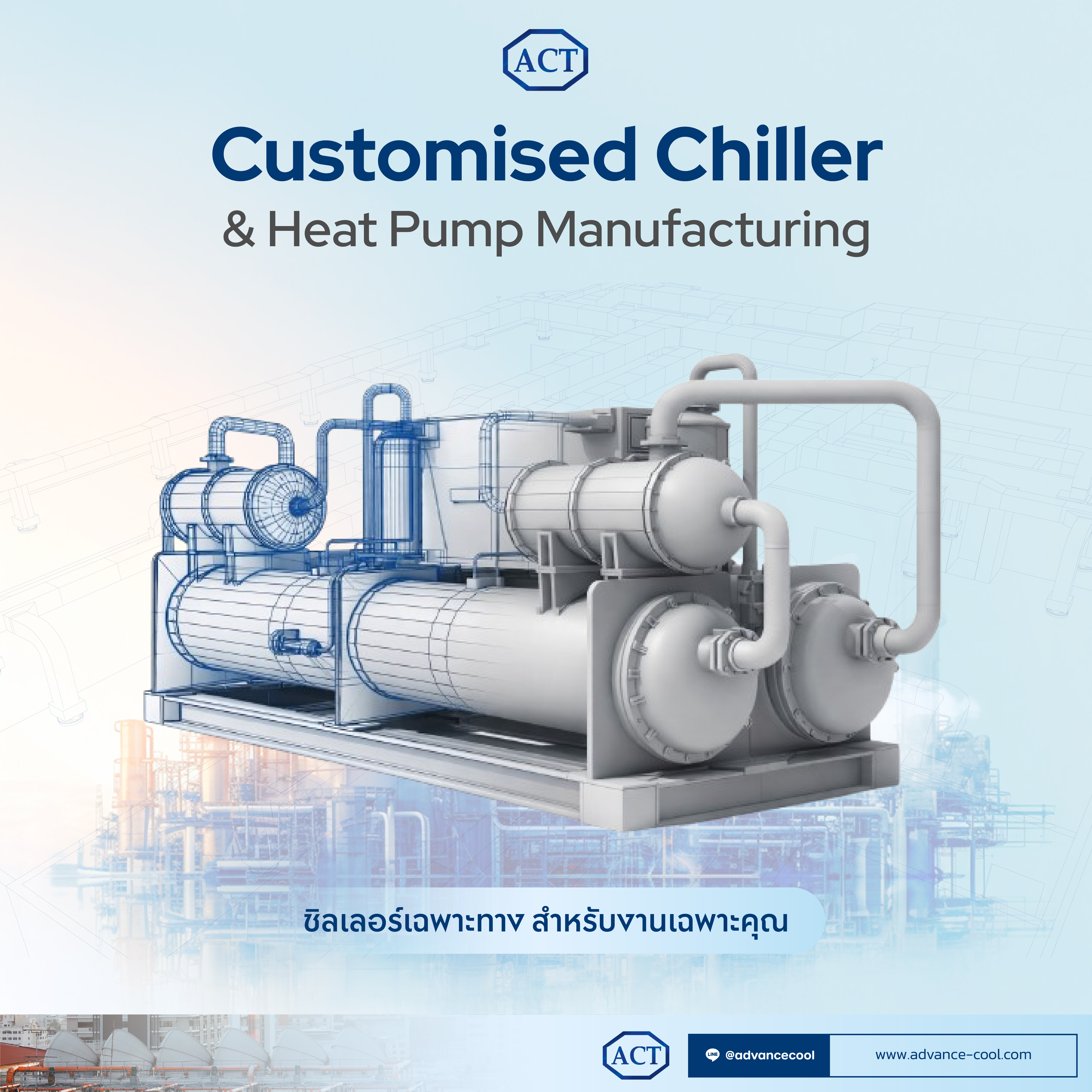 จุดเด่นของ Custom Chiller คือระบบทำความเย็นที่สามารถออกแบบและผลิตขึ้นใหม่ตามเงื่อนไขการใช้งานจริงของลูกค้า ไม่ว่าจะเป็นอุณหภูมิที่ต้องควบคุม ความต่อเนื่องของโหลด ข้อจำกัดด้านพื้นที่ หรือการเชื่อมต่อกับระบบเดิม