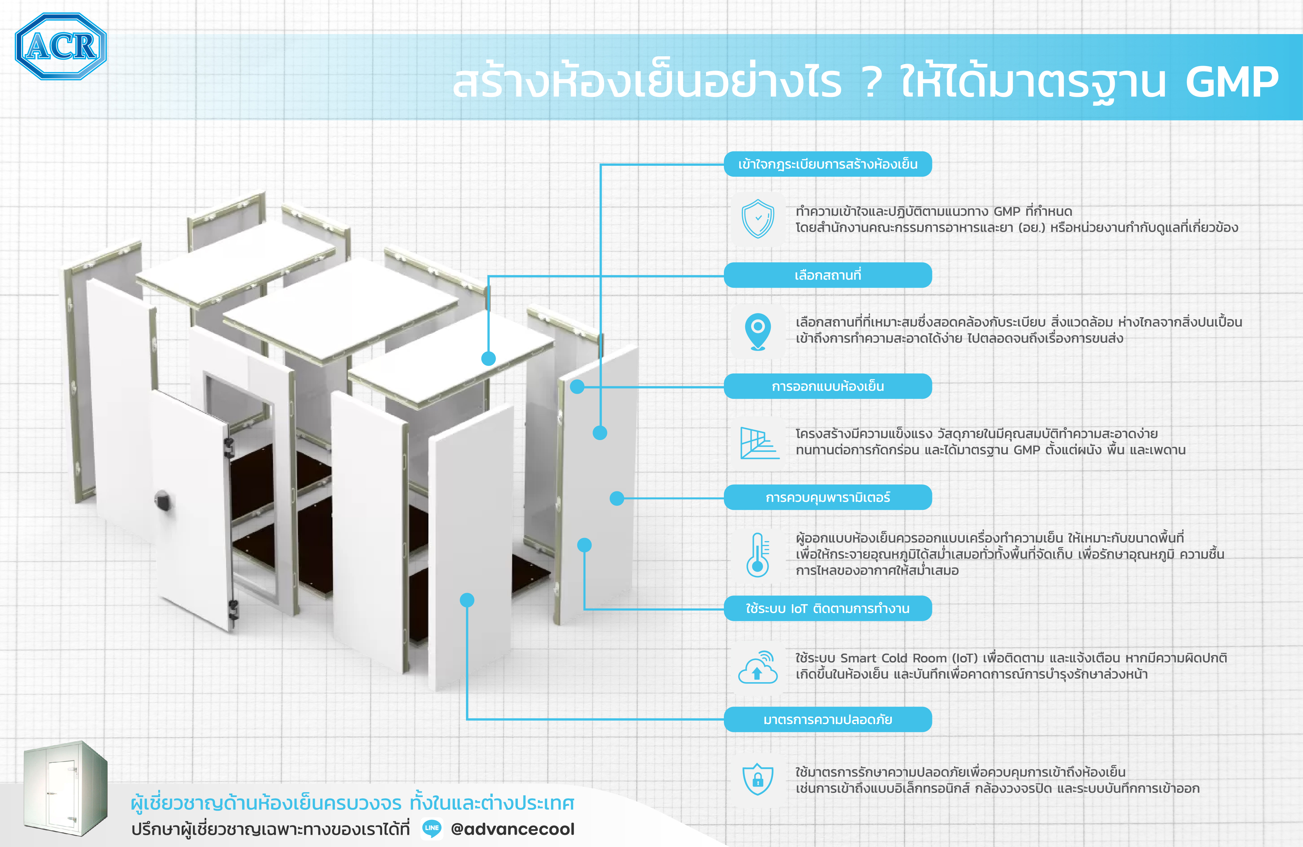 การสร้างห้องเย็นเพื่อให้เป็นไปตามมาตรฐาน Good Manufacturing Practice (GMP) ควรวางแผนอย่างรอบคอบในหลายด้าน ไม่เพียงแต่ด้านออกแบบห้องเย็น หรือระหว่างก่อสร้างเท่านั้น ยังเกี่ยวข้องไปถึงการศึกษาด้านกฎระเบียบต่างๆ และการใช้งานหลังจากส่งมอบอีกด้วย