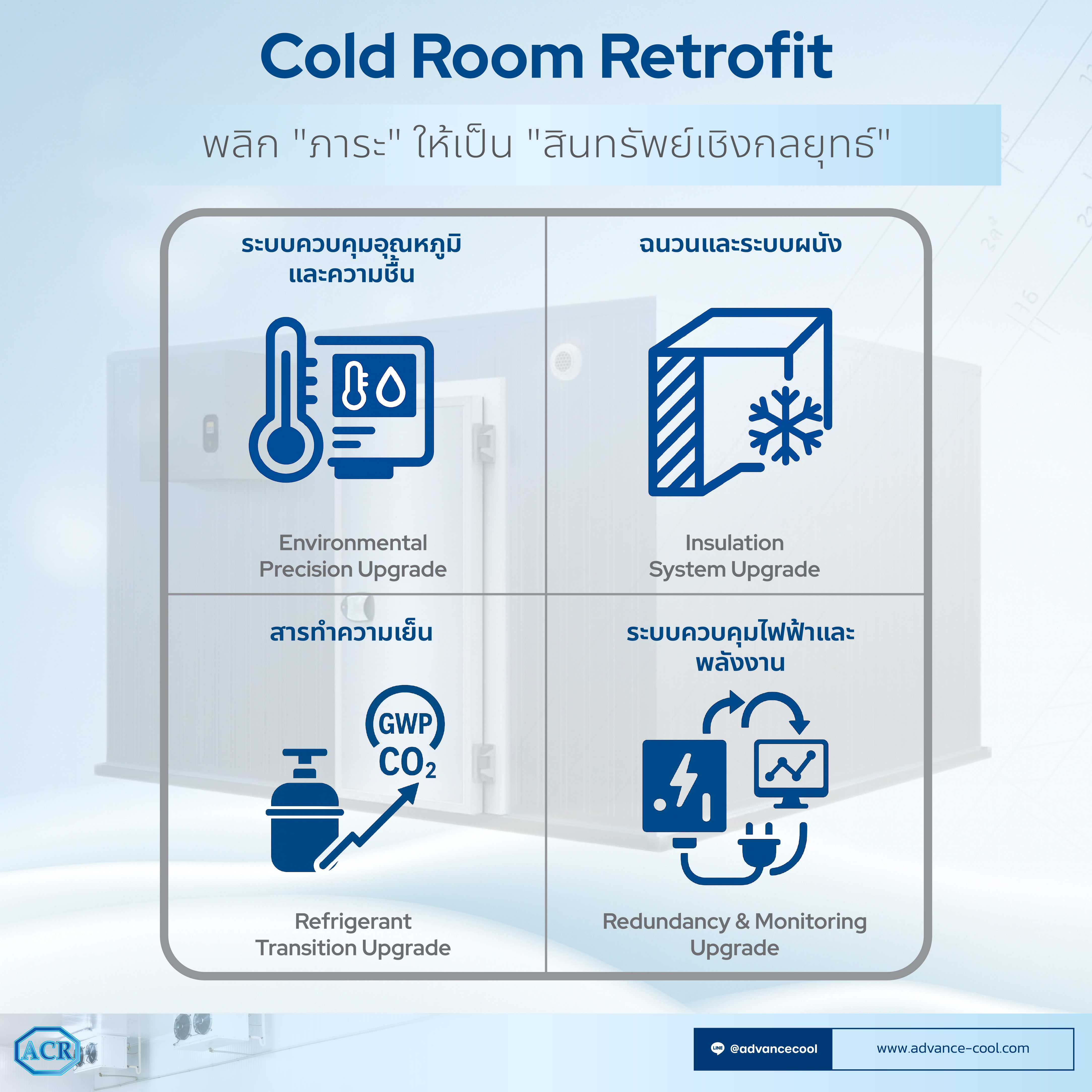 การอัปเกรดห้องเย็นเก่าจึงไม่ใช่แค่ทางเลือก แต่เป็น การลงทุนเชิงกลยุทธ์ ที่จะพลิกโฉมธุรกิจของคุณให้ก้าวทันความต้องการใหม่ๆ ทั้งในประเทศและการส่งออก รวมถึงรองรับอุตสาหกรรมมูลค่าสูงอย่างยาและเครื่องสำอาง