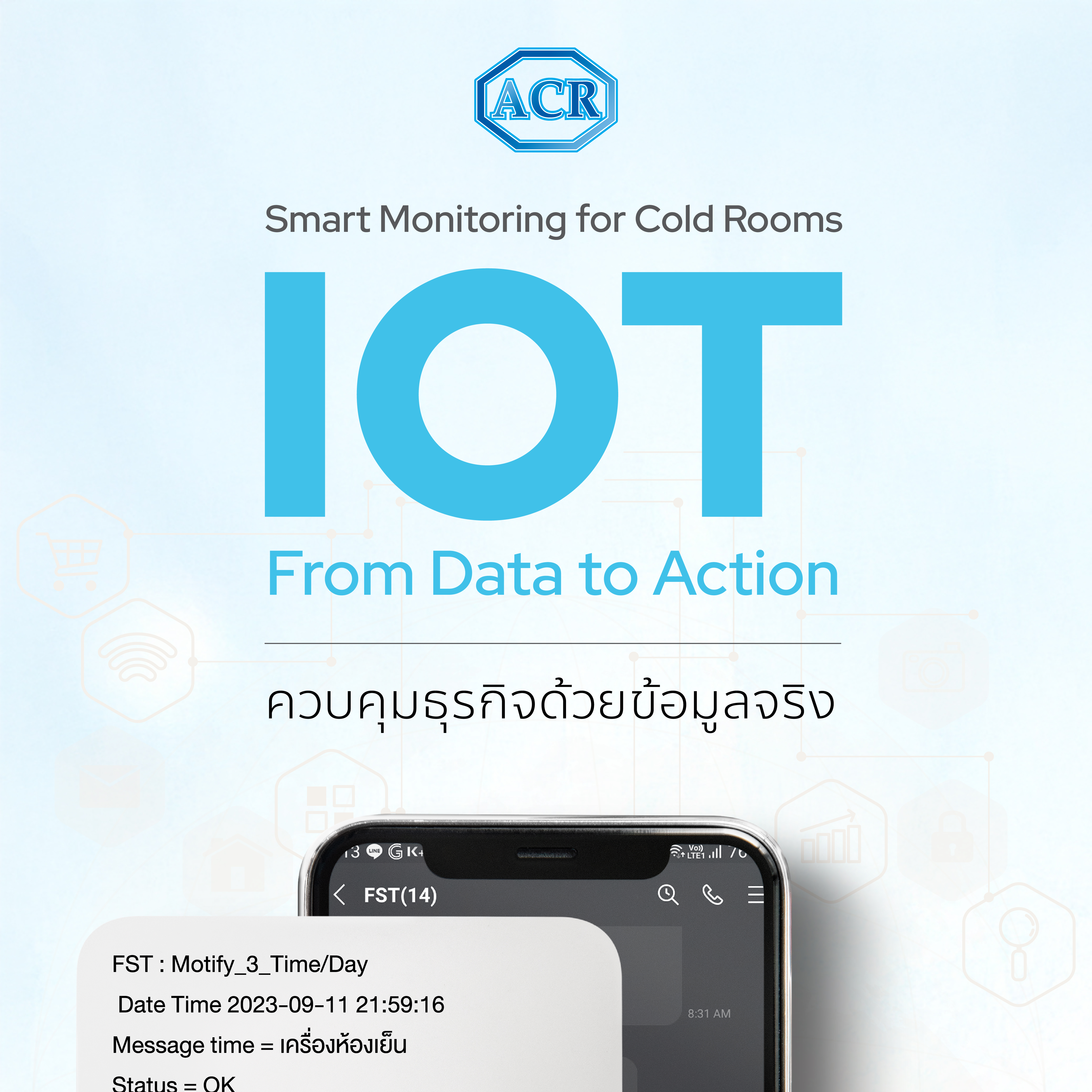 ระบบ IoT ห้องเย็นประกอบด้วย เซ็นเซอร์ วัดอุณหภูมิ ความชื้น กระแสไฟฟ้า ความดัน ฯลฯ ถูกติดตั้งในจุดสำคัญ เซ็นเซอร์เหล่านี้จะส่งข้อมูลผ่าน Gateway ออกสู่อินเทอร์เน็ตไปยัง แพลตฟอร์มคลาวด์ ที่เก็บและประมวลผลข้อมูล