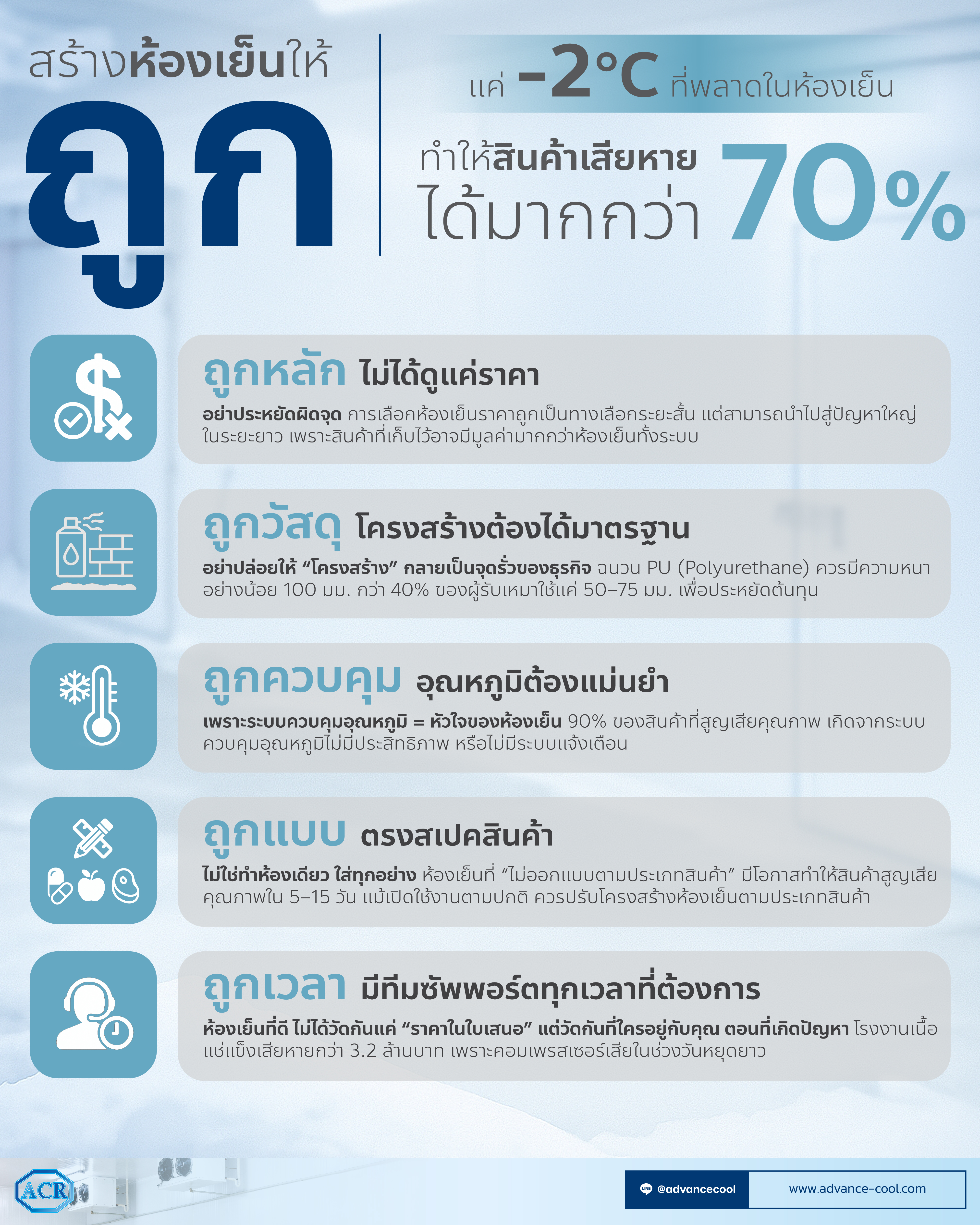 ผู้รับเหมาสร้างห้องเย็น จำเป็นต้องพึ่งพาประสบการณ์และองค์ความรู้ใหม่ๆ เพื่อจัดหาโซลูชั่นที่ดีที่สุด และคุ้มค่าที่สุดสำหรับความต้องการของลูกค้า และจำเป็นต้องเข้าใจถึงองค์ประกอบ และสิ่งที่จะเป็นปัจจัยสำคัญที่มีผลกระทบต่อประสิทธิภาพ พลังงาน รวมไปถึงราคาห้องเย็น