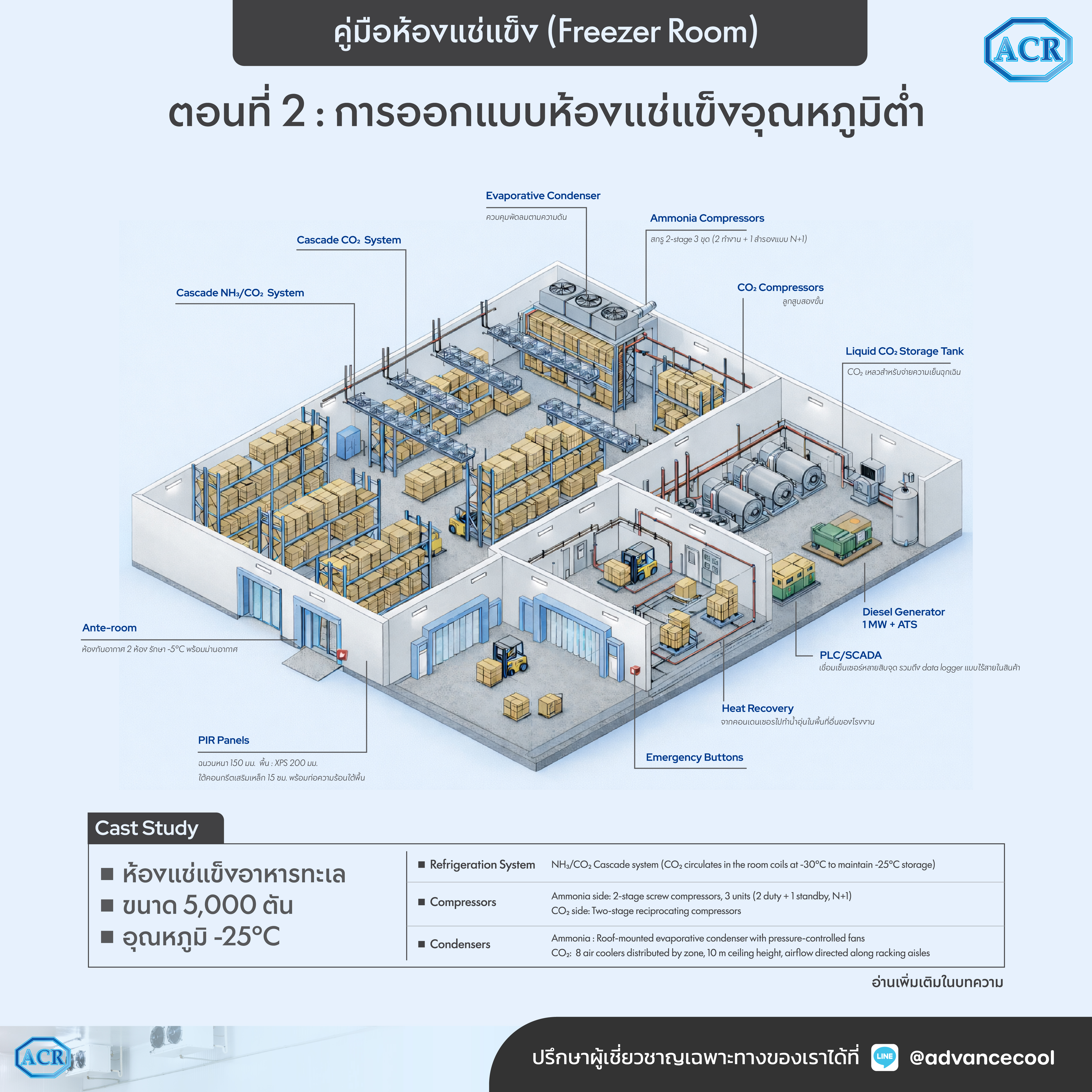 การออกแบบห้องแช่แข็ง ตั้งแต่การเลือกระบบทำความเย็นและสารทำความเย็น การคัดเลือกอุปกรณ์หลัก การออกแบบฉนวนและโครงสร้างห้อง, ระบบควบคุมและระบบสำรอง ไปจนถึงแนวคิดการประหยัดพลังงานและการบริหารความเสี่ยง