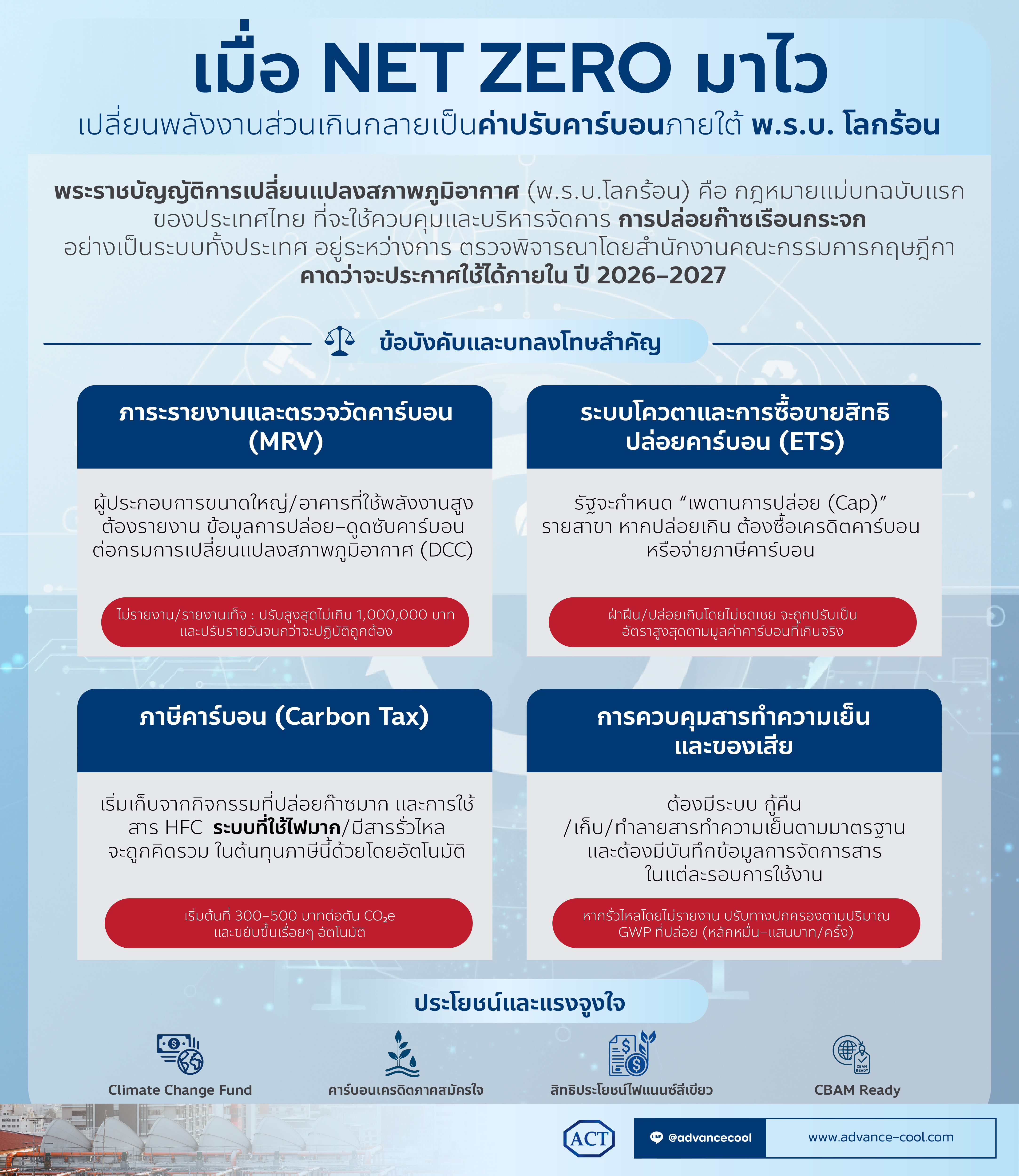 พระราชบัญญัติการเปลี่ยนแปลงสภาพภูมิอากาศ กำลังจะกลายเป็นกฎหมายฉบับสำคัญของไทยในการจัดการการปล่อยก๊าซเรือนกระจกอย่างเป็นระบบ โดยใช้กลไกทางกฎหมายควบคู่กับแรงจูงใจทางเศรษฐกิจ เพื่อให้ประเทศไทยเดินหน้าไปสู่ เป้าหมาย Net Zero
