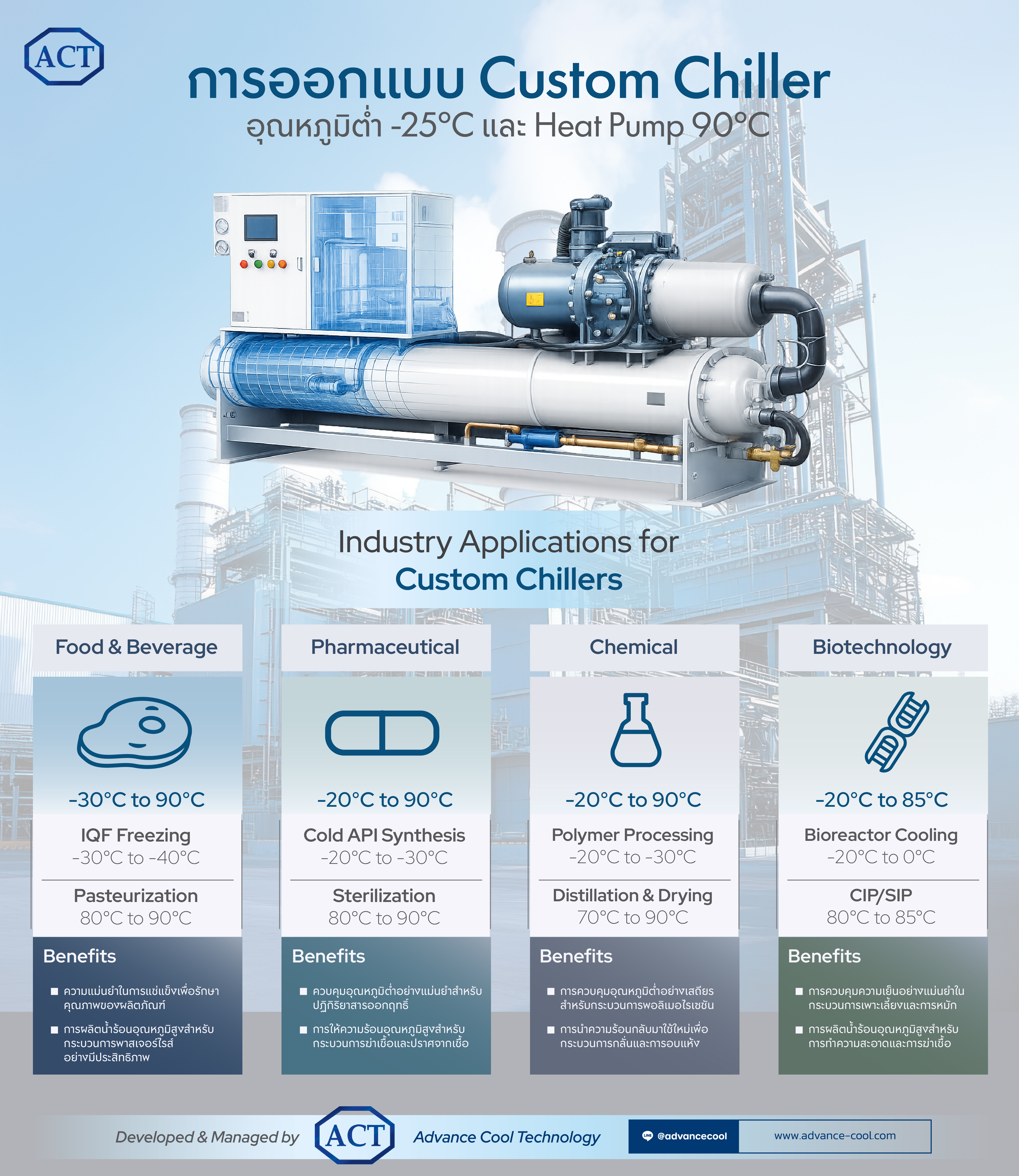 จุดเด่นของ Custom Chiller คือระบบทำความเย็นที่สามารถออกแบบและผลิตขึ้นใหม่ตามเงื่อนไขการใช้งานจริงของลูกค้า ไม่ว่าจะเป็นอุณหภูมิที่ต้องควบคุม ความต่อเนื่องของโหลด ข้อจำกัดด้านพื้นที่ หรือการเชื่อมต่อกับระบบเดิม